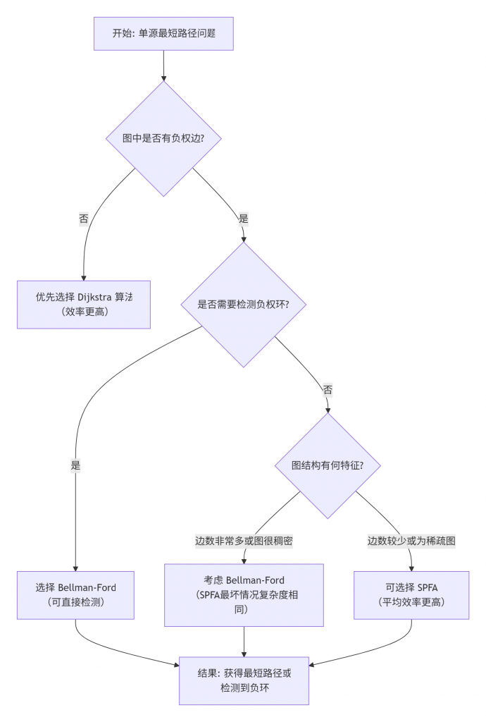 了解一个算法的优缺点和适用场景,与理解其原理同等重要。为了帮助你更直观地理解Bellman-Ford在算法家族中的位置,以及如何在具体问题中做出选择,可以参考下面的决策流程图: