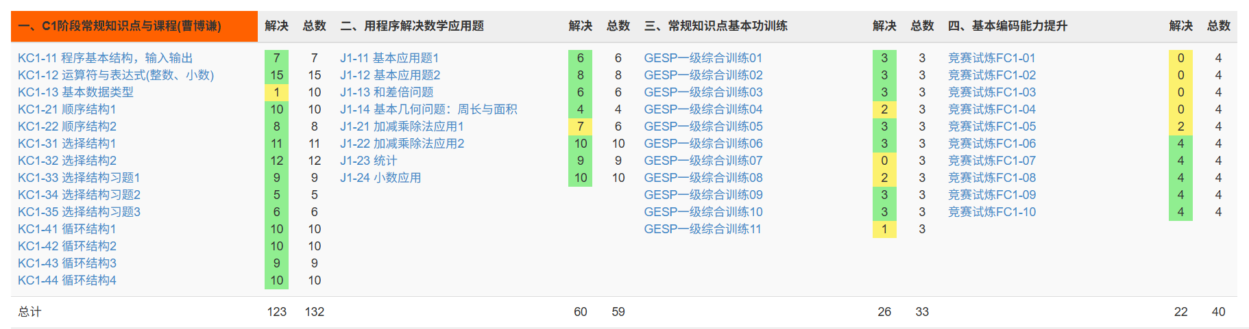 5、查看某某学生的C1~C9阶段通过的题目数量统计方法1:打开”排名”菜单,找到学生后面的链接进入可查看该学员的每个阶段的题目完成数量情况。极个别章节的数据不准确,可能是题单有删除过题目的原因,无需纠结。